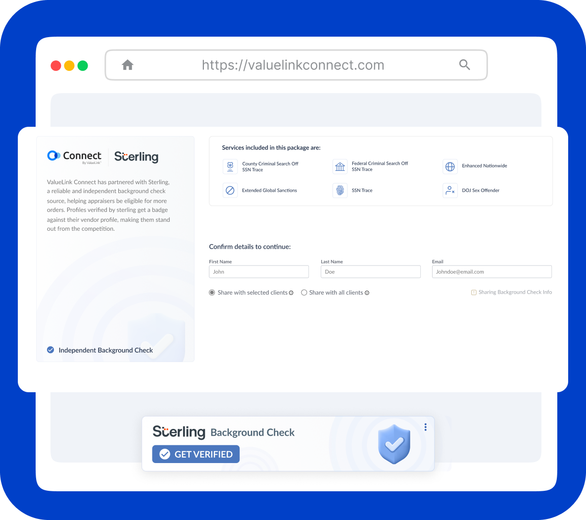 With clear background check status indicators on your profile, clients see that you’re a credible appraiser they can count on. If your check ever needs updating, you can simply restart the process.